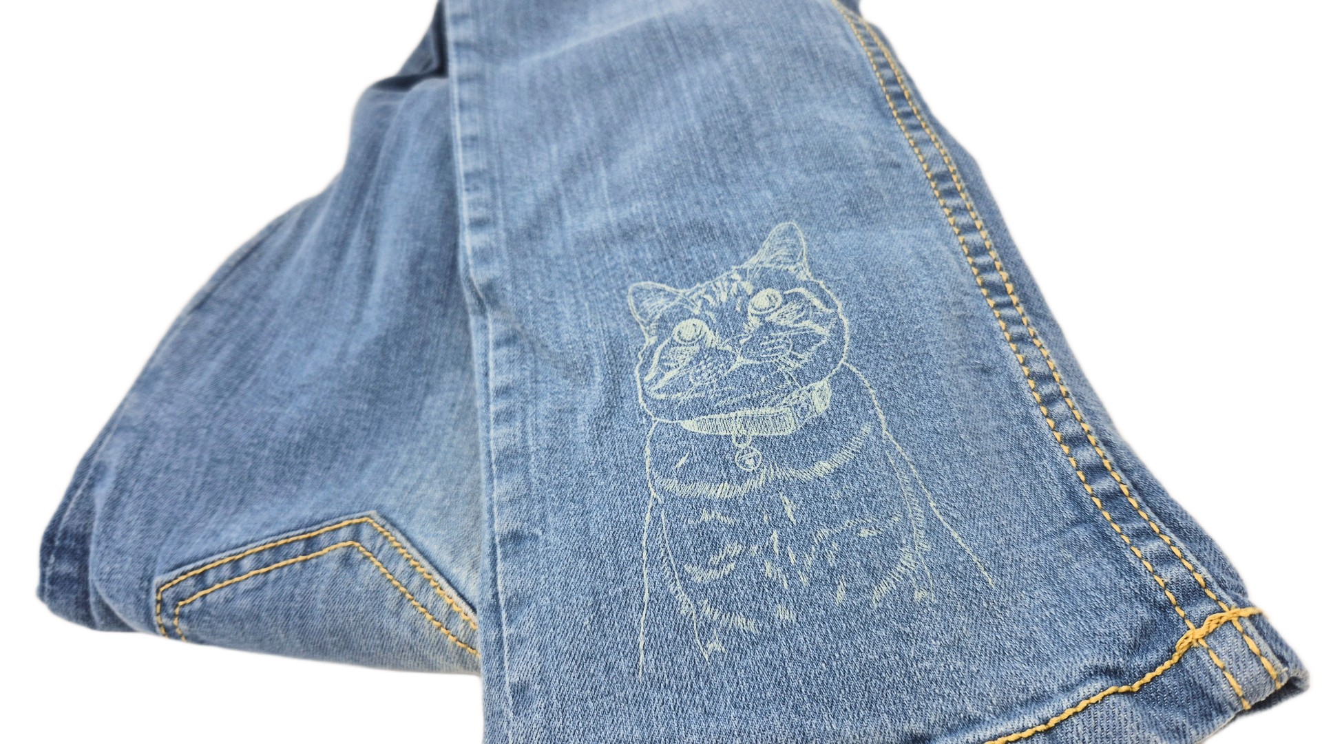 Ukázka naší práce: Zákazník nám zaslal fotografii svého mazlíčka, kterou jsme digitálně překreslili do podoby vhodné pro laser a následně vygravírovali přímo na nohavici džínových kalhot.