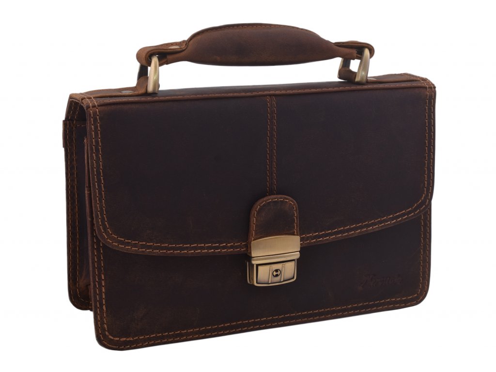 Pánská příruční taška udělaná v kůži v přírodní úpravě. Taška je určena k nošení osobních věcí (peněženka, doklady, brýle, mobil, pera, malý zápisník apod.) Taška se nosí v ruce nebo za boční odnímatelnou rukojeť na karabině.
