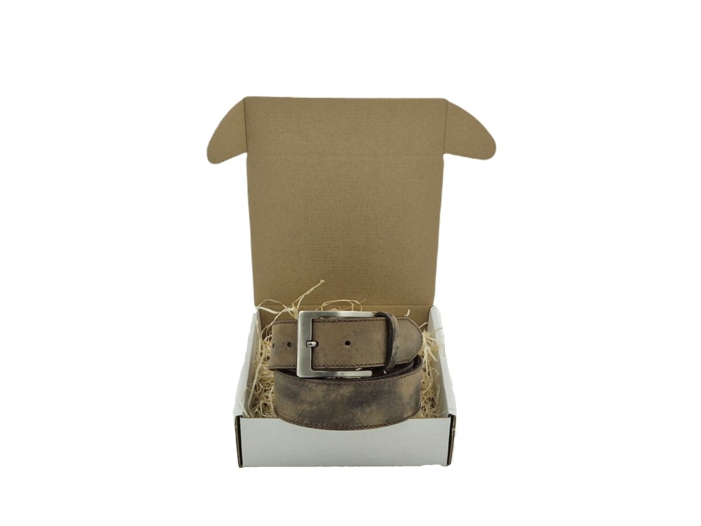 Bílá krabička pro opasek 30-50 mm. Je naplněna dřevitou vlnou, která dotváří přírodní vzhled balení.