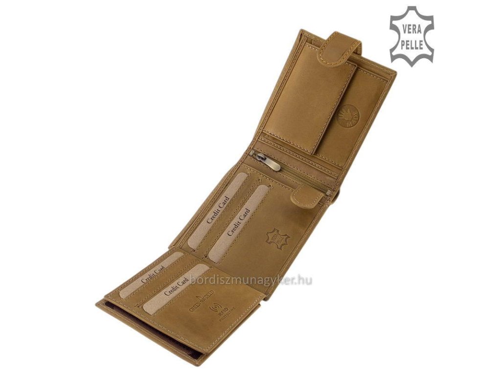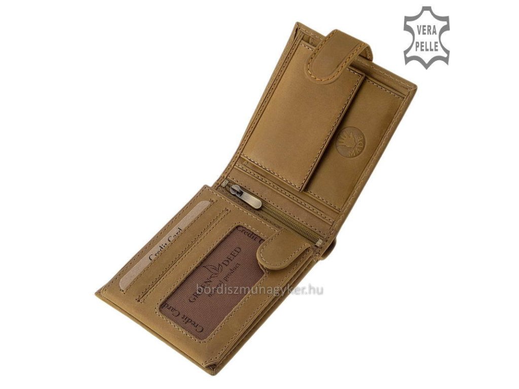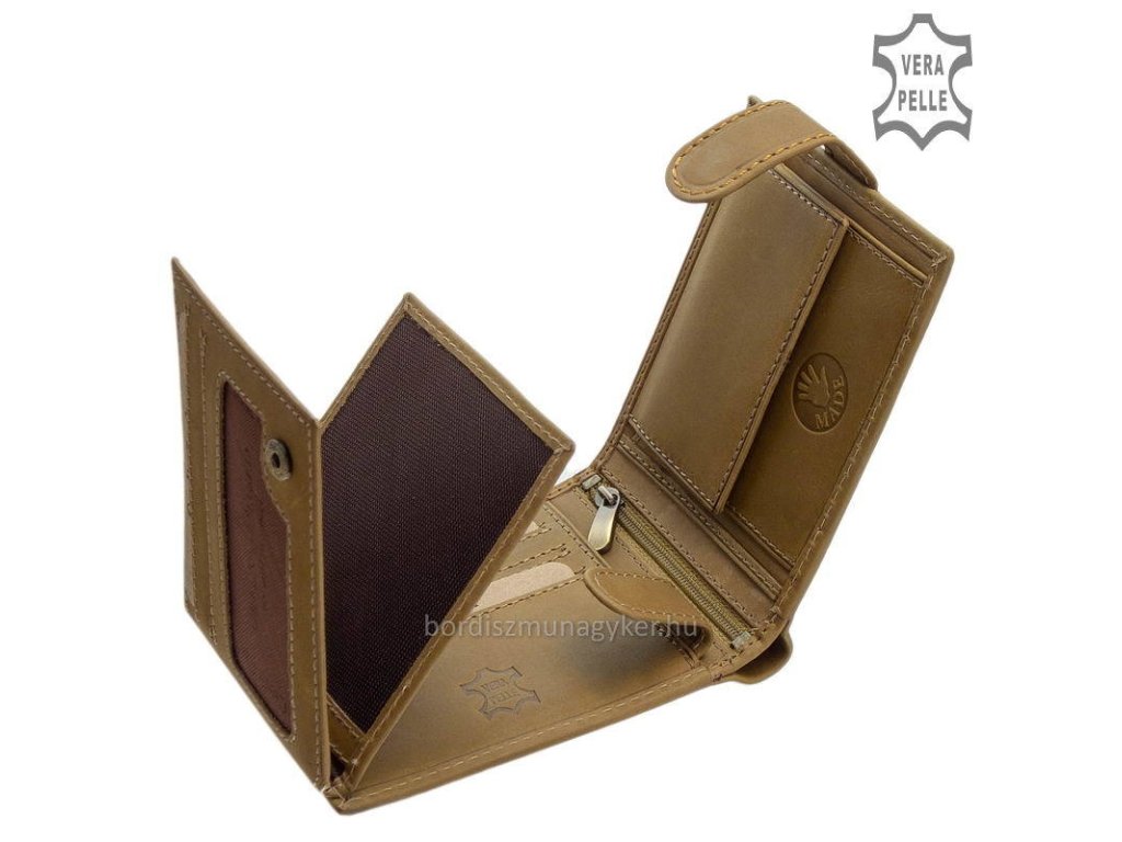 Na pravé straně, je umístěn mincovník, na levé straně najdete přihrádky na karty a doklady s klopovým řešením a praktickým zapínáním na řemínek s drukem a několik průhledných přihrádek, které jsou ideální pro uložení průkazů s fotografií. Na horní části jsou dvě dělené přihrádky na bankovky s hedvábnou podšívkou, které slouží k oddělení různých nominálních hodnot měn. Uprostřed se nachází užitečná kapsa na zip s bočními kapsami vlevo a vpravo.