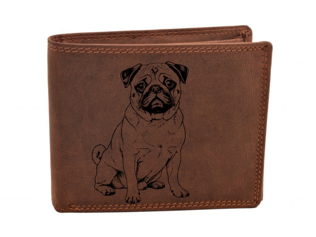 Pánská kožená peněženka z prémiové lícové kůže, vytvořená speciálně pro milovníky psů. Tento model zdobí detailní motiv plemene mops. Kvalitní zpracování a přírodní materiál zaručují, že peněženka bude sloužit dlouhá léta.