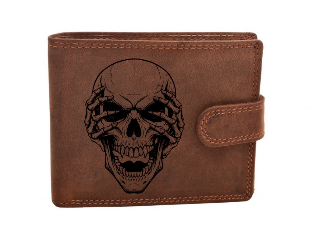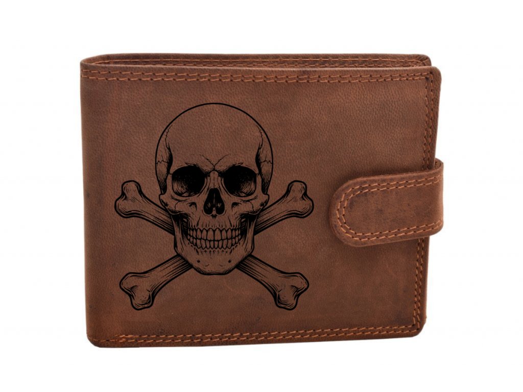 Stylová peněženka pro milovníky temných motivů – lebka deroucí se z otvoru doplněná o další dvě lebky s hnáty. Peněženka je vyrobena z kvalitní přírodní broušené kůže, která je příjemná na dotek a vyniká svou odolností. Klasický model s velkorysým uspořádáním nabízí dostatek místa pro karty, bankovky i mince.