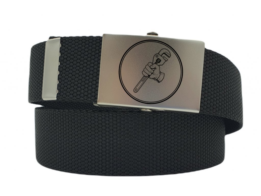 Zakázkový textilní opasek se sponou s motivem loga pro instalatéry - hasák s rukou o šířce 4 cm je stylový a vysoce funkční doplněk pro každodenní nošení. Černý látkový opasek je osazen sponou dle vašeho výběru, která díky motivu lebky a možnosti individuálního gravírování vytvoří z opasku unikátní osobní předmět.