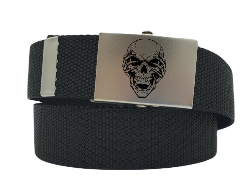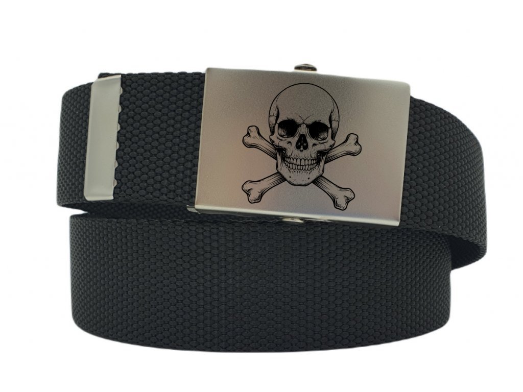 Zakázkový textilní opasek se sponou s motivem lebky o šířce 4 cm je stylový a vysoce funkční doplněk pro každodenní nošení. Černý látkový opasek je osazen sponou dle vašeho výběru, která díky motivu lebky a možnosti individuálního gravírování vytvoří z opasku unikátní osobní předmět.